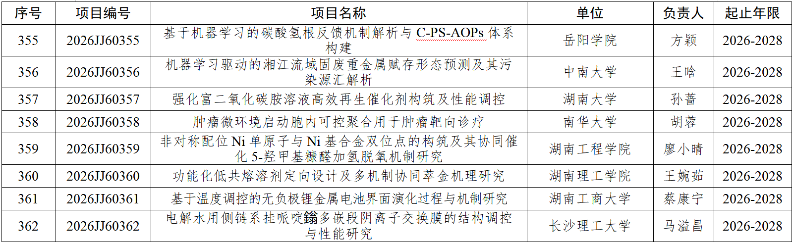 2026年度湖南省自然科学基金项目(第一批)实施目标和立项名单